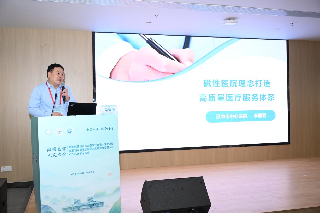 汉中市中心医院党委书记李国强以《磁性医院理念打造高质量医疗服务体系》为题,阐述了以人文关怀为核心的管理理念,强调吸引和留住优秀人才、提升服务质量的重要性。
